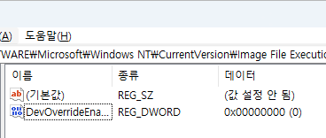 DevOverrideEnable이라는 파일의 값 데이터를 0으로 수정하는 것이다..